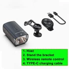wireless remote control bicycle lighting, multifunctional bracket reverse high beam light, cut-off line, anti glare bicycle light, bicycle glare flashlight, waterproof bicycle lighting and bicycle accessories suitable for various road conditions. Product specification: Waterproof grade: IP65 (light rain, splashing water) Product material: aluminum alloy Exposure distance: over 300 meters LED: Flat car lamp beads Bracket: Multifunctional extension bracket (4 bracket options) Charging and discharge protection: built-in overcharge and discharge ICs. Extending battery life Working voltage: 3.7V Product color: black Lighting mode: strong light lighting; Medium light; Weak light; Burst flash Intelligent mode: automatic start stop function LED color temperature: 7500K Charging type: TYPE-C 2A fast charging - USB charging Battery: Built-in 5000 mA/h rechargeable lithium battery Switch settings: wireless remote control Lens type: cu