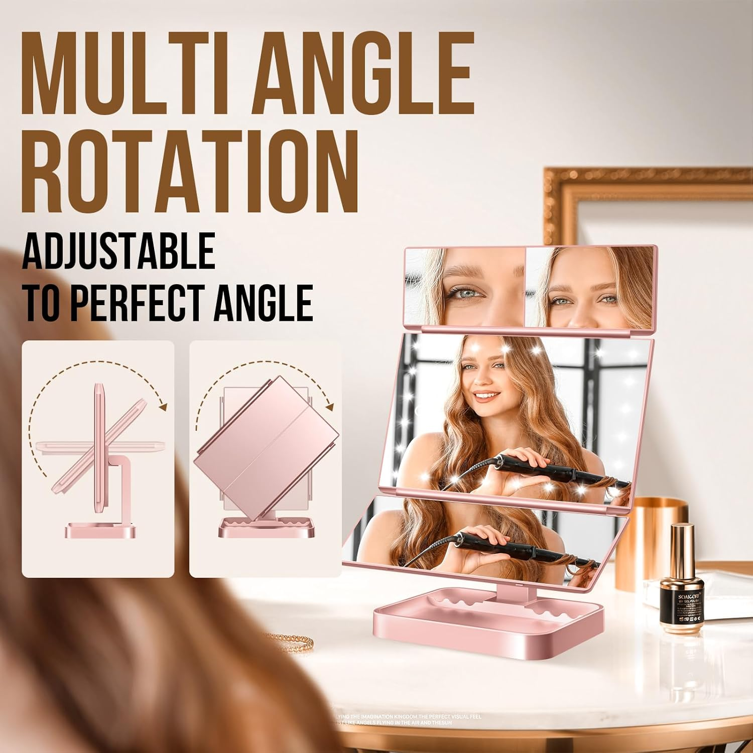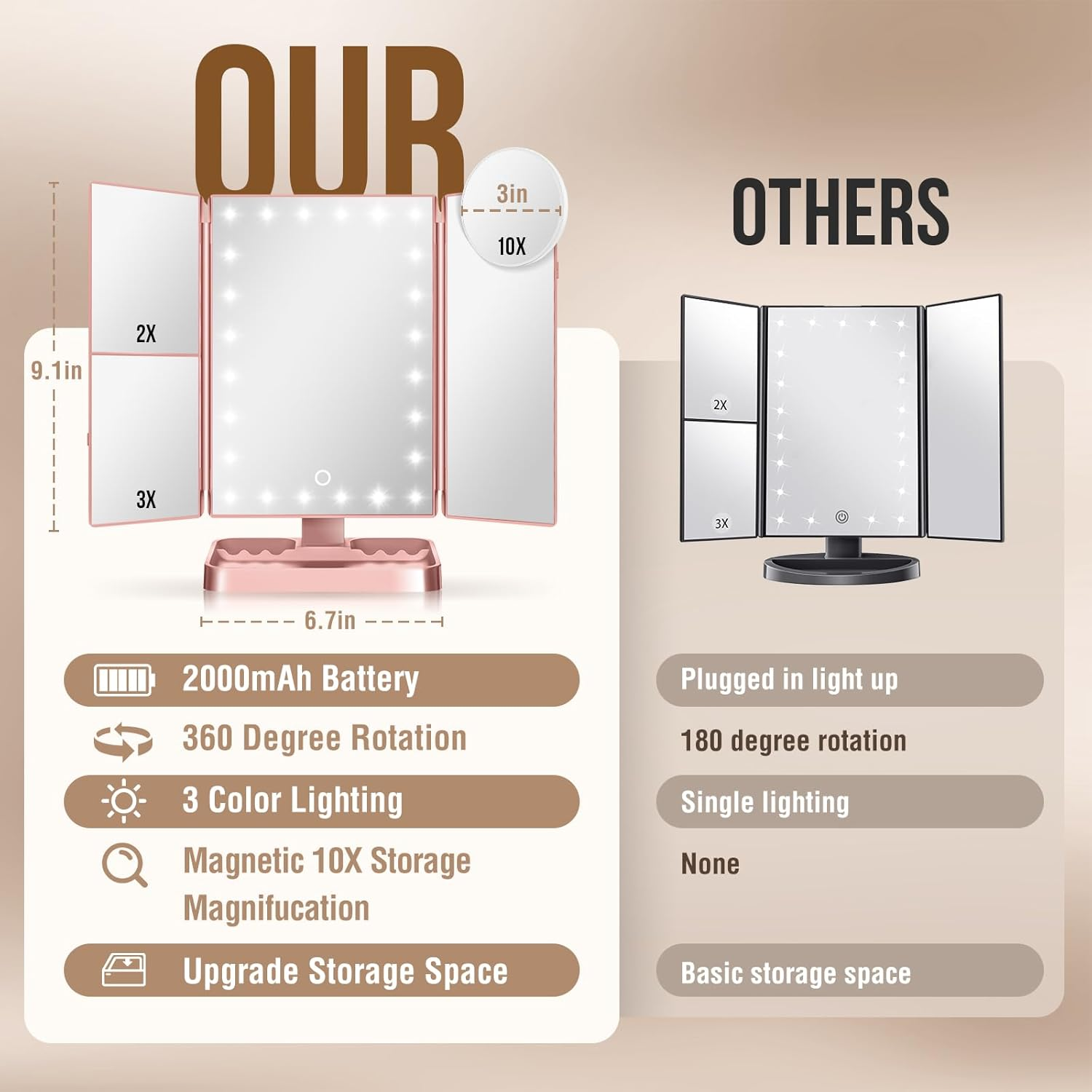 Rechargeable lighted makeup mirror, built- n rechargeable 2000mAh battery saves the cost of replacing the battery, lasts longer, and the brightness is 30% higher than other power supply methods 3 color lighting and adjustable brightness; this makeup mirror has 3 color lighting, cold, warm, and natural light, providing 3 light scene; Press the touch screen switch, changing the color of light; hold the touch switch longer, brightness dim or bright 10X,3X,2X magnification; The lighted makeup mirror has 4 panels magnifying and wide-angle viewing, 10X,3X,2X magnification; see clearly your face and make a flawless makeup 360 degree rotation and removable base; adjust the makeup mirror as per the suitable viewing angle you need; a removable base from the cosmetic mirror, good for traveling Perfect gift; birthday gift, Valentine's Day gift, Mother’s Day gift, Father's Day gift, Chrimas gifts for family, wife, girlfriend, or another special day gift; Customer first; we can sthelp if you have any issues with your purchase Product Description