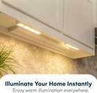 Quick and Easy Installation: Includes heavy-duty adhesive tape and screws for versatile mounting options; stick up lights work in kitchens, closets, pantries, garages, and more Simple Tap Light Function: On and off tap light makes it easy to use; touch the lens to activate, ideal for under counter and cabinet lights for kitchen, bathroom, or closet spaces Bright and Long-Lasting: Emits 65 lumens with a warm white 3000K glow; the LED light bar provides bright illumination without the need to replace LEDs over time Ultra Thin Design: At only 1 inch thick, this battery LED light fits seamlessly under cabinets, on bookshelves, or in closets; blends into any decor without being intrusive Battery Powered Convenience: Operates on 3 AA batteries (not included); long-lasting brightness and efficiency make it ideal as a battery-operated push light for daily use Product Description Brilliant Evolution Battery Operated Ultra Thin LED Bar Light The battery operated ultra thin LED bar light can quickly and easily light up any area. This bar light is bright at 65 lumens and is perfect as under cabinet lights, kitchen lights and closet lights. The battery powered light produces a warm white glow (3000K) for beautiful LED under cabinet lighting or kitchen lighting. Easily mount the wireless LED light anywhere with adhesive tape or screws (both are included). Then simply press the tap lens on the under cabinet light to turn it on/off. The Brilliant Evolution LED battery light has a run time of over 100 hours, using 3 AA batteries (not included). The wireless LED bar light offers a versatile lighting option. The LED bar light is not only an aesthetically pleasing lighting solution but also a budget friendly one. . Bright and Beautiful The LED bar light is bright at 65 Lumens. This small, but powerful, battery powered LED light will make your dark areas both bright and beautiful. Great as under counter LED light for kitchen areas or as a cabinet LED light in your house, the Wireless LED bar light will brighten your world. Sleek and Powerful The LED bar light is less than 1 inch thick. Press the tap lens to turn the light on/off. The light bar mounts with screws or adhesive tape (both are included). Battery Operated The LED bar light operates on 3 AA batteries (not included) and has a run time of over 100 hours. The run time is 4 times longer than other lights.