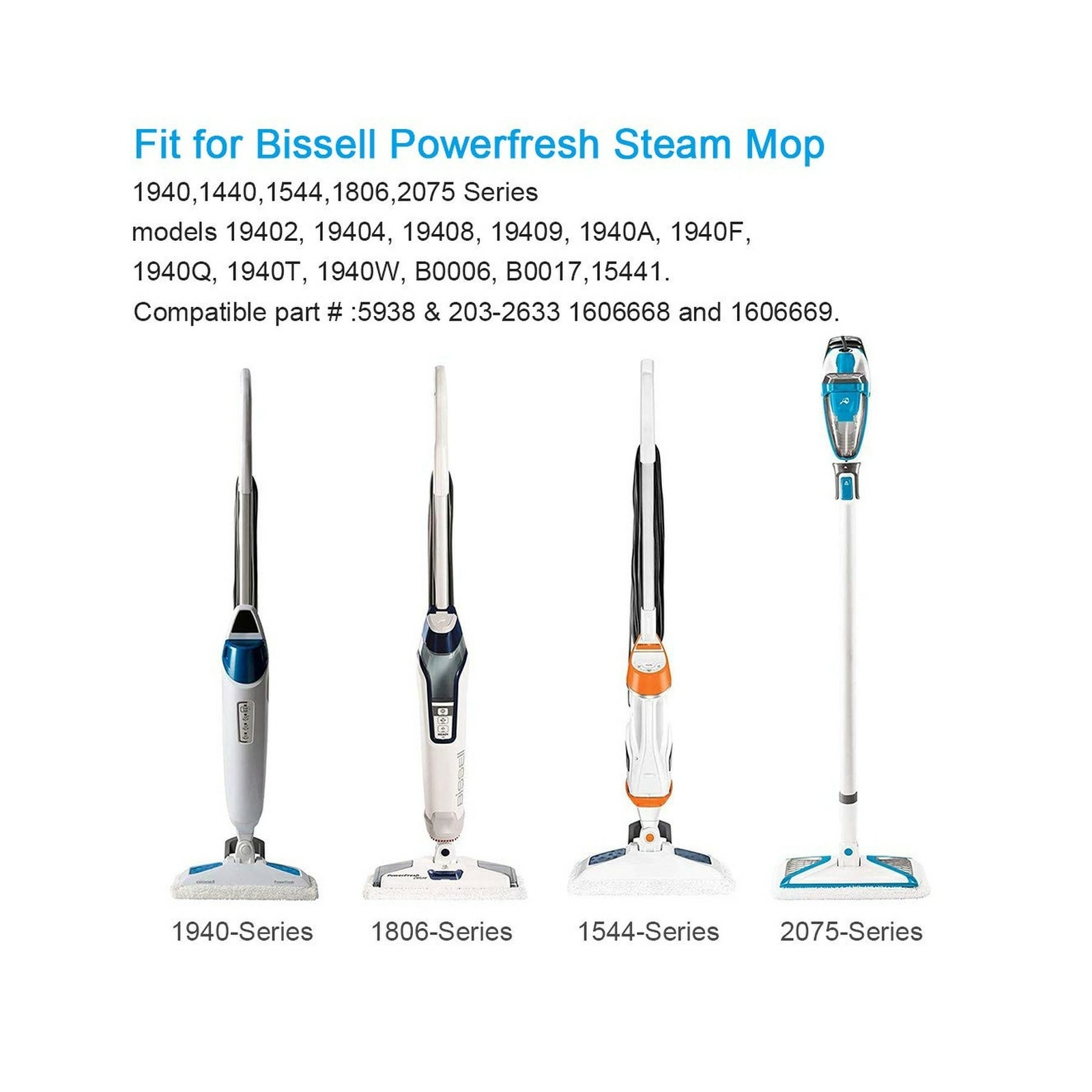 Product Details Package Dimensions: 9.6 x 6.5 x 2.6 inches Item Weight: 9.6 ounces Manufacturer: Wisorder Item model number: 5938 Batteries Required?: No TWO TYPES OF PADS: 4 pack bissell replacement pads included, 2 soft microfiber mop pads for everyday cleaning, 2 soft microfiber mop pads with scrubbing strips for tough, stickier messes COMPATIBILITY: Fit for Bissell Powerfresh Steam Mop 1940 1440 1544 1806 2075 series, model 19402 19404 19408 19409 1940a 1940f 1940q 1940t 1940w B0006 B0017 1544A 15441 2075A 2685A 2181, compatible part #: 5938 & 203-2633 1606668 and 1606669. FEATURES: Bissell powerfresh steam mop pads are reusable, highly absorbent, anti-scratch, strong decontamination, non-depilation, durable and easy to clean, machine washable FIT FOR ALL FLOORS: Bissel steam mop cleaner pads are ideal for all kinds of floors and surfaces, including wooden floor, ceramic tile, laminate floor, marble floor, carpet, etc. WARRANTY:You are 100% covered for a 30 day no risk, money back guarantee and 1 year manufactures warranty. Wisorder will never fail you!
