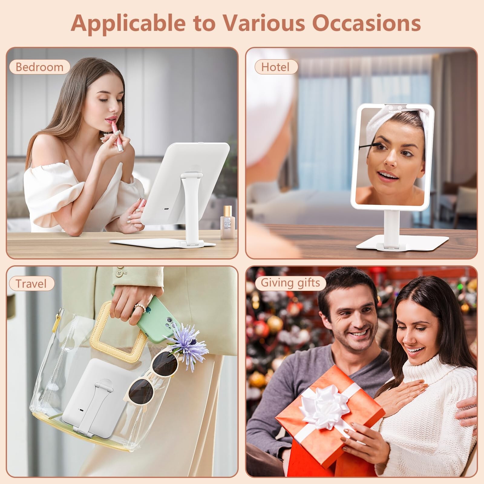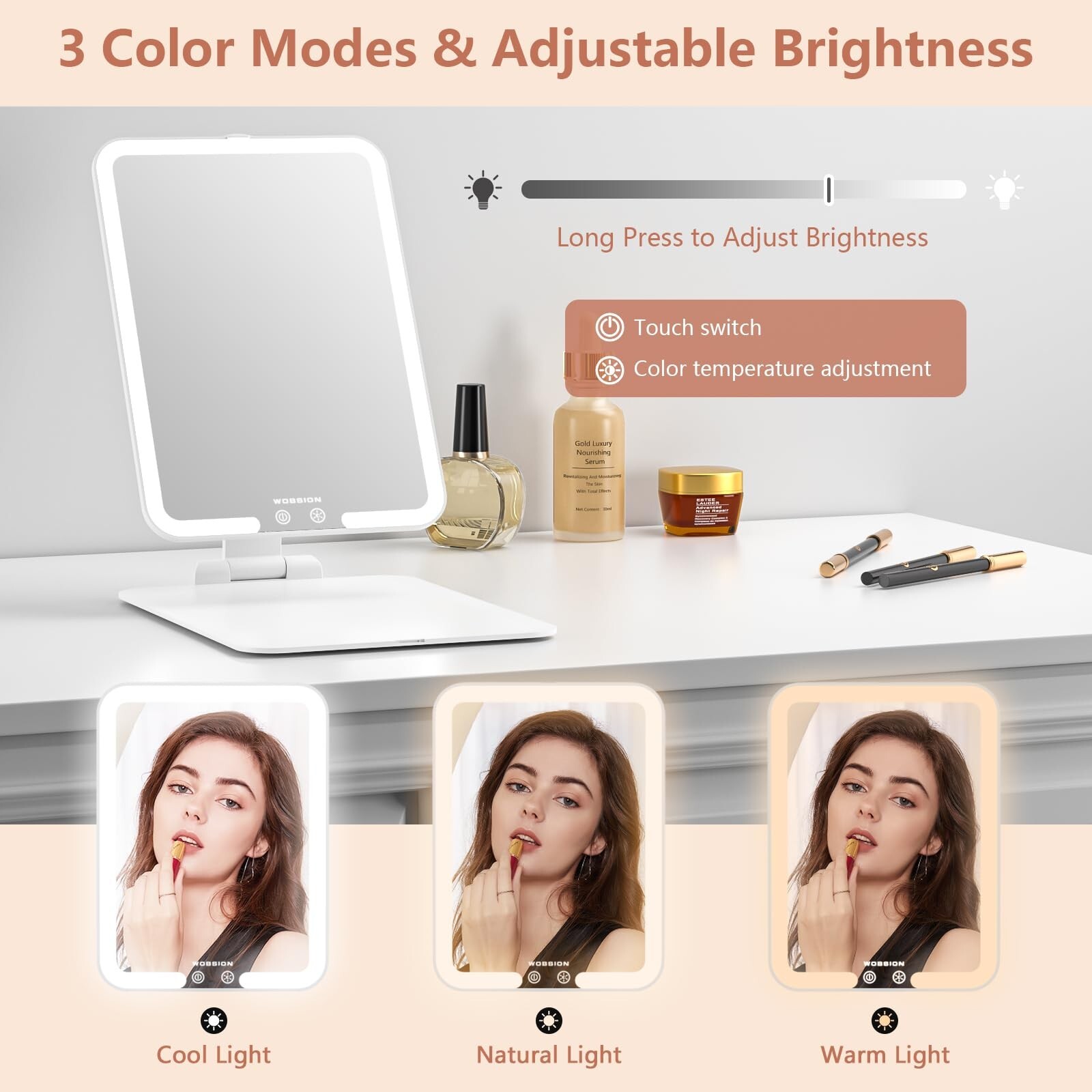 wobsion Travel Makeup Mirror, 7.4 * 5.1in Rechargeable Portable Folding Makeup Mirror with Lights, 3 Colors Light Up Mirror with 48 LEDs,Dimmable,Multiple Angles and High Adjustable,Gift,White Product Details Brand: wobsion Room Type: Outdoor Shape: Square Product Dimensions: 7.4"L x 5.1"W Frame Material: Acrylonitrile Butadiene Styrene (ABS) Brand: wobsion Room Type: Outdoor Shape: Square Product Dimensions: 7.4"L x 5.1"W Frame Material: Acrylonitrile Butadiene Styrene (ABS) Style: Modern Mounting Type: Tabletop Mount Special Feature: MAGNETIC DESIGN, Smart Lighting-Light will be turned on/off with the mirror leaving/close to the support rod, Memory Function, Energy Saving-Light will auto off after 15 minutes without operation, 10X MAGNIFICATION Color: White Theme: Travel Specific Uses For Product: Makeup Number of Pieces: 1, 2 Number of Items: 1 Material: Acrylonitrile Butadiene Styrene Frame Type: Framed Assembly Required: No Manufacturer: Shenzhen Wobsion Technology Co.,Ltd Item Weight: 15.2 ounces Country of Origin: China Item model number: BM-2313 Batteries: 1 Lithium Ion batteries required. (included) Date First Available: December 28, 2023 180Horizontal and Vertical Adjustment:A perfect desktop makeup mirror,our this desk mirror not only can you adjust the angle of the mirror, but you can also adjust the height.It can be suitable for different height makeup tables to meet your makeup needs anytime, anywhere And our this small mirror for desk is designed with anti -sliding bars on the back,prevent the mirror from sliding, Tips:Please remember to tear the protective film of the anti -sliding bars before use Smart Lighting&Energy Save&Memory Function:New design, The light of the make up mirror will be turned on/off with the mirror leaving/close to the support rod And our this lighted mirror has an energy -saving mode,when the mirror is open, the light will auto turn off after 15 minutes You don't have to worry about the lights being on all the time when you leave halfway during use, which will run out of power. This is the humanized design of our make up mirror with lighting 3 Color Modes&Adjustable Brightness:This vanity mirror with lights has a three-color temperature light mode, including warm light, white light, and daylight. You can choose a suitable color temperature according to different environments, and you can also adjust the brightness of the light according to different times to meet your needs,more usage needs Travel Essentials for Women:Ultra Slim Lighted Makeup Mirror,7.4 in*5.1 in*0.59 in,Compact Travel Size,foldable and equipped with a waterproof storage bag, it is very portable and can be well stored in your handbag, suitcase,and backpack etc Rechargeable Compact Mirror:Configure large -capacity 850 mah battery, which be fully charged only need 1.5 hours. When the power is insufficient, there will be a red indicator light flashing Awesome Gift:It is excellent beauty gift, for Christmas,Mother's Day,Valentine's Day,useful and cute