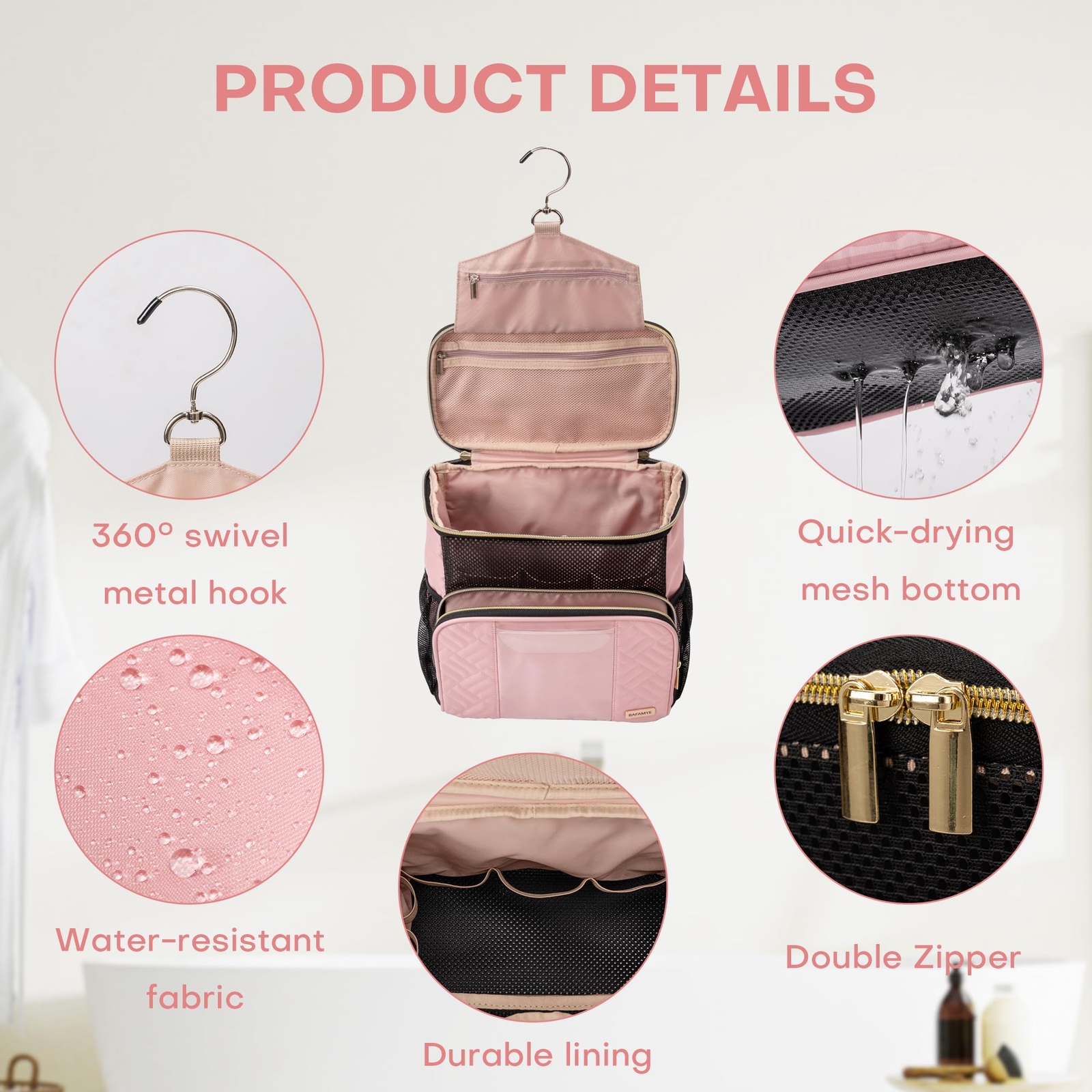 BAFAMYE Women's Hanging Travel Toiletry Bag - Large, Durable, Multipurpose and TSA Approved for the Modern Traveling Woman, Pink Capacious Design - With dimensions of 10in x 10in x 6in, this travel toiletry bag for women can easily accommodate up to 2.6 gal or 9.8L worth of essentials, making it a convenient toiletry bag for women traveling. Durability and Quick-Dry - Fabricated from sturdy oxford fabric and PVC, the BAFAMYE toiletry bag for women exhibits enhanced durability and fast drying abilities. Say goodbye to prolonged wait times for a dry bag! TSA-Compliant - Travel without worry as this women's toiletry travel bag adheres to TSA guidelines, making it a preferred TSA toiletry bag. Unique Multipurpose Use - This women's hanging toiletry bag is not only for travel but can also be utilized for gym use, outdoor activities, and home storage. Truly a toiletry travel bag women would find indispensable! Convenient Phone Access - Not many toiletry bags allow you to keep using your phone in the shower. This unique feature sets our hanging toiletry bag for women apart from others. SHIPPING Domestic Buyers - We have confidence in our products, but if you are not fully satisfied please contact us within 30 days of purchase and you will get full refund. - We ship within 3 business days of payment, usually sooner - We offer FREE shipping on all orders! - We only ship to the lower 48 states, no APO/FPO addresses or PO Boxes allowed International buyers – please note: Import duties, taxes, and charges aren't included in the item price or postage cost. These charges are the buyer's responsibility. - Please check with your country's customs office to determine what these additional costs will be prior to bidding or buying. * Order Cancellation Policy ** You can return a product for up to 30 days from the date you purchased it. 1. The seller reserves the right to cancel the special case only due to eBay cancellation fee. 2. The decision of seller is the final. 3. The seller will respond to the cancellation request within 2 business days. Please wait for the result of cancellation. 4. In case the cancellation is not completed by some reasons, the buyer can follow the options below to get the refund. 4.1 The buyer can reject the item when it arrives. 4.2 The buyer can send the item back to the seller within 30 days If the buyer receives item (USA Shipment ONLY). The seller will provide the FREE return label to the buyer when the buyer opens " Return Item" case on eBay by using the reason as "Change my mind" ONLY. 5. When buyer has placed the order. The order will be processed and completed by automatic warehouse system within 5 minutes. In case that buyer sends the cancellation request after 5 minutes of placing the order, the request will be rejected. **Sending direct message to cancel the order is not allowed for every case.* Return Policy For the return case - If buyer would like to return the items for refund or replacement, please CONTACT SELLER to receive the free return label from seller. The refund or replacement will be processed with the tracking number of return label which is provided by seller only. The other ways of return which are not approved by seller will not be processed for the refund or replacement.