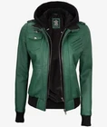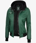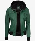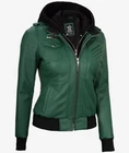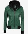 Women's New Removable Hood Moto Racer Biker Real Sheepskin Green Leather Jacket Product Descriptions: Material: 100% Genuine Sheepskin Leather Internal: Soft Skin Friendly Polyester Lining Colour: Green Style: Moto / Biker / Trucker Front: Zipper Closure Front Features: Shoulder Epaulets & Removable Hood Collar: Belted & Buckle Collar Pockets: Five Pockets Outside & One Pocket Inside Cuffs: Rib-Knitted Cuffs Hemline: Rib-Knitted Stitching: Excellent Quality Care: Dry Clean Only