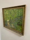 This stunning artwork by Reverend Kim Williams beautifully captures the tranquility of a woodland scene. The painting features a vibrant forest with a winding path and two figures resting on a stone bench, creating a charming and peaceful composition. The lush greenery and meticulous details bring the setting to life, evoking a sense of serenity and connection with nature. Measuring 58.5 cm in height and 68.5 cm in width, the artwork is set in an ornate gold-tone frame that compliments its timeless appeal. Perfect for art collectors or anyone looking to add a touch of countryside beauty and storytelling to their home. A fine example of Reverend Kim Williams' artistic talent and ability to portray the beauty of natural settings. We take great care to provide accurate descriptions, and we encourage you to thoroughly review the accompanying photos for a comprehensive understanding of the item's details. If you have any questions or need additional information, please don't hesitate to reach out to us.