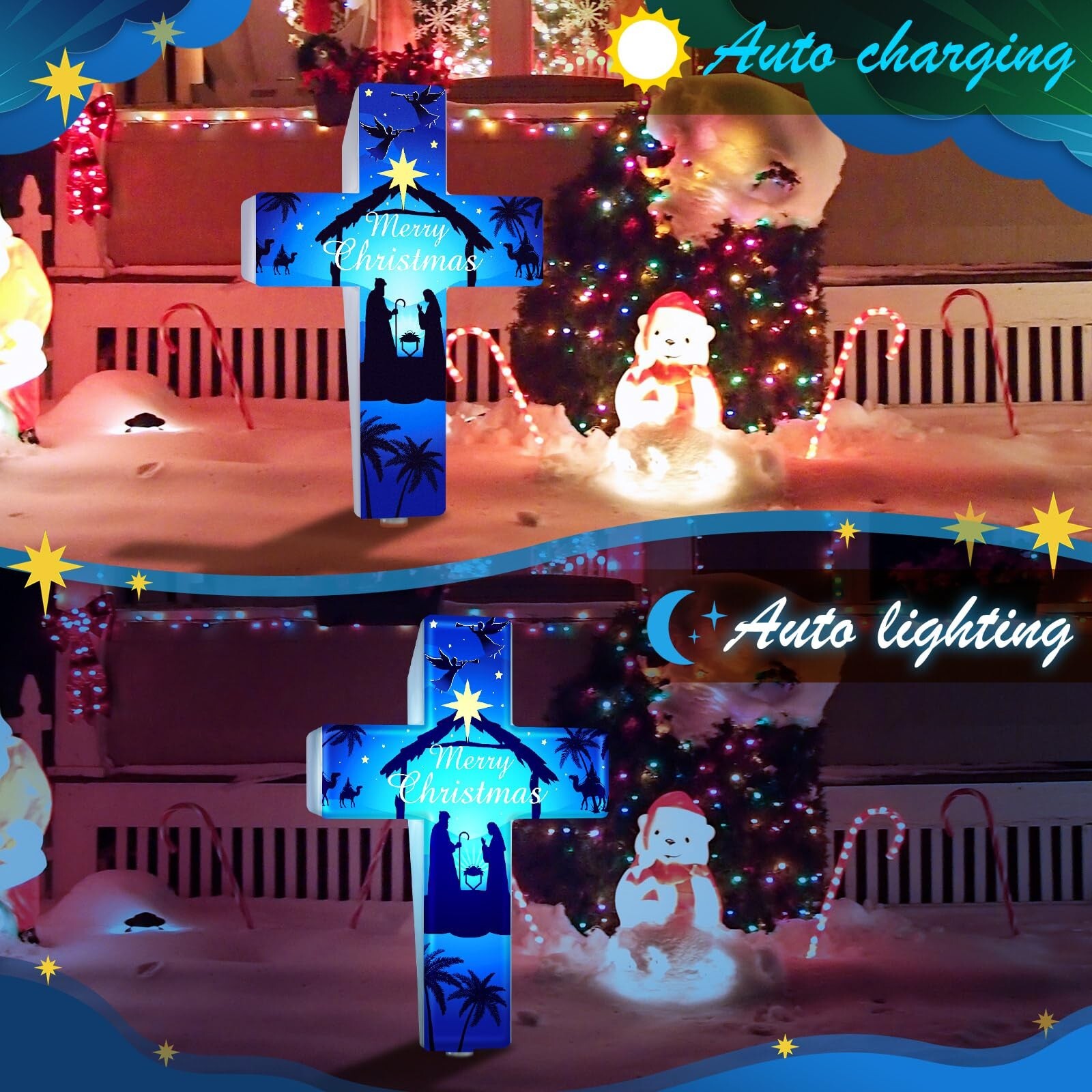 Yousoontic Christmas Garden Stake Solar Lighted Nativity Scene Outdoor Solar Religious Yard Decorations Light up Rustic Holy Night Cross Stake Decor for Christmas Outside Patio Yard Decoration Product Details Color: blue, black Brand: Yousoontic Material: Resin Theme: Christmas Frame Material: Resin Light Color: Warm White Recommended Uses For Product: Cemetery decoration, roadside memorials, flower arrangements, garden decoration, graveside decor, landscaping, walkway lighting, yard decoration Manufacturer: Yousoontic Number of Items: 1 Part Number: TAT-Yousoontic-0471 Item Weight: 1.19 pounds Package Dimensions: 14.7 x 10.48 x 2.92 inches Country of Origin: China Item model number: TAT-Yousoontic-0471 Size: 13.78 x 9.84 x 2.95 inches Style: Nativity Power Source: Solar Powered Item Package Quantity: 1 Included Components: 1 x Memorial solar stake cross Batteries Required?: No Date First Available: May 24, 2024 Cross Solar Decoration: unique cross shape solar pile decoration, this nativity theme solar cross is designed with a classic cardinal pattern, and when night falls, the light automatically lights up, bringing a peaceful atmosphere Easy to Use: the cemetery grave decor has a switch on the back to turn the power on and off; It is solar operated and the panels are located on the back of the cross; When the sunset, the lights go out and then come on after sunset; Just make sure to turn on the power Reliable Product: this beautiful cemetery decoration is made of reliable and weather resistant plastic that can withstand various weather conditions and is sturdy and durable; Can be applied for cemetery decoration, roadside commemoration, and flower arrangement; Very suitable for streetlights and buried lights, very suitable for gardens, graves, flower beds, landscapes, sidewalks Right Size: measuring about 14.6 x 9.8 x 2.7 inches/ 37 x 25 x 7 cm, this solar operated nativity theme graveside decor is a garden accessory that works well in many spaces; Lay flat on the garden floor, landscape or patio or yard; You can also lean against a tree or flower pot Meaningful symbol: the yard decor is more than a simple form; It is a powerful representation of faith, sacrifice, and love; Our cross underscores this, serving as a vibrant beacon of faith; It radiates warm, astonishing lights, making your yard standout; The spiritual resonance of the cross makes it a fitting tribute, remembering the love and sacrifices of those we miss