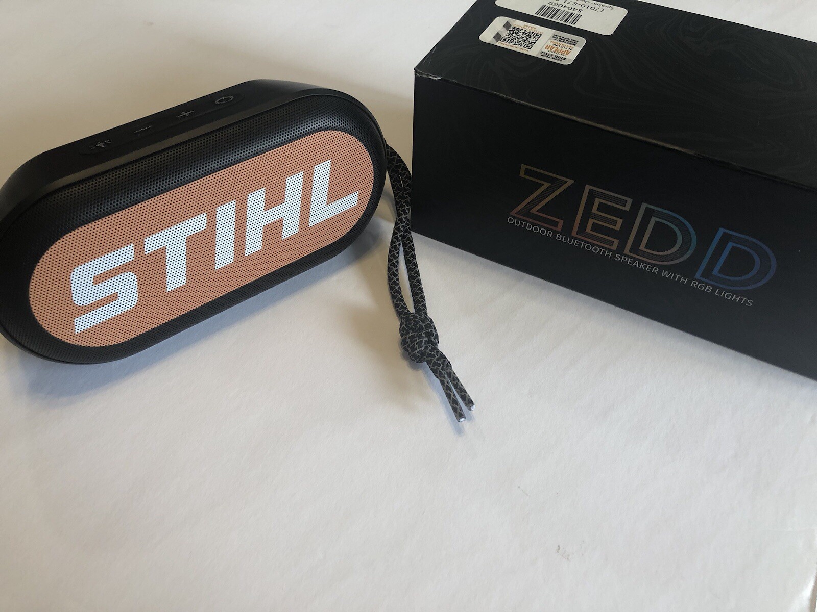 ZEDD Outdoor Bluetooth Speaker with RGB Lights. Has Orange STIHL logo on front of speaker. Has a carrying strap.