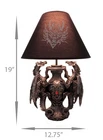 This wickedly awesome table lamp features two dragons flanking either side of a mystical urn accented with a bright red cabochon stone that seems to glow, guarding the light that springs forth from the urn. Cast in resin, it`s hand-painted in dark Gothic hues with silvery metallic highlights, and stands 19 inches high, 9.75 inches wide, 5.25 inches deep, and includes a complementing 8.25-inch high, 13.25-inch diameter black fabric shade printed with a silver tribal emblem. It has a velvet effect bottom to help protect display surfaces, uses 1 type A 40-watt maximum bulb (not included), and has an in-line thumbwheel switch on the 54-inch long cord to easily turn it on or off. It`s a medieval accent perfect for a dungeon castle, and makes a gift any dragon master is sure to admire! Our eBay Store About Us Add to Favorite Sellers Gothic Guardians of Light Medieval Dragons Resin Table Lamp - Dark Fantasy - 19 Inches High - With Black Fabric Tribal Dragon 13 Inch Diameter Lampshade Impressive Dimensions - The base stands at 19 inches high, 9 3/4 inches wide, and 5 1/4 inches deep, exuding a grand presence. Darkly Elegant Shade - The fabric shade measures 7 5/8 inches high and 12 5/8 inches in diameter, casting a beautiful glow when illuminated. Artistic Gothic Touch - The lamp features an awesome hand-painted dark Gothic finish, enhancing its mysterious and medieval allure. Striking Accent - A bright red cabochon stone accents the lamp, adding a pop of color and intrigue to the overall design. Illumination Details - This lamp uses 1 Type A 40 Watt Max. Bulb (not included), ensuring a warm and inviting ambiance in any room. Illuminate your space with an aura of mystique and gothic charm using this remarkable dragon-themed table lamp. Crafted from durable resin, this lamp features two menacing dragons guarding a mystical urn adorned with a vibrant red cabochon stone that emanates an enchanting glow. The lamp stands tall at 19 inches, with a width of 9.75 inches and a depth of 5.25 inches, creating a captivating presence on any table or desk. Each intricate detail of the dragons and the urn is meticulously hand-painted in dark gothic hues, accented by silvery metallic highlights, adding a touch of medieval allure to your room. The lamp comes with a stylish 8.25-inch high, 13.25-inch diameter black fabric shade, featuring a silver tribal emblem at its center, enhancing its gothic appeal. Designed with practicality in mind, the lamp includes a velvet-effect bottom to protect your furniture, and its in-line thumbwheel switch on the 54-inch long cord allows for effortless control. Illuminate your bedroom, study, or living space with this extraordinary piece of fantasy decor. Perfect for those who appreciate gothic aesthetics and dragon lore, this lamp also makes an enchanting gift for any dragon enthusiast. Elevate your home's ambiance with this bewitching gothic creation. Product Details Color Black Height 19 Length 12.75 Weight