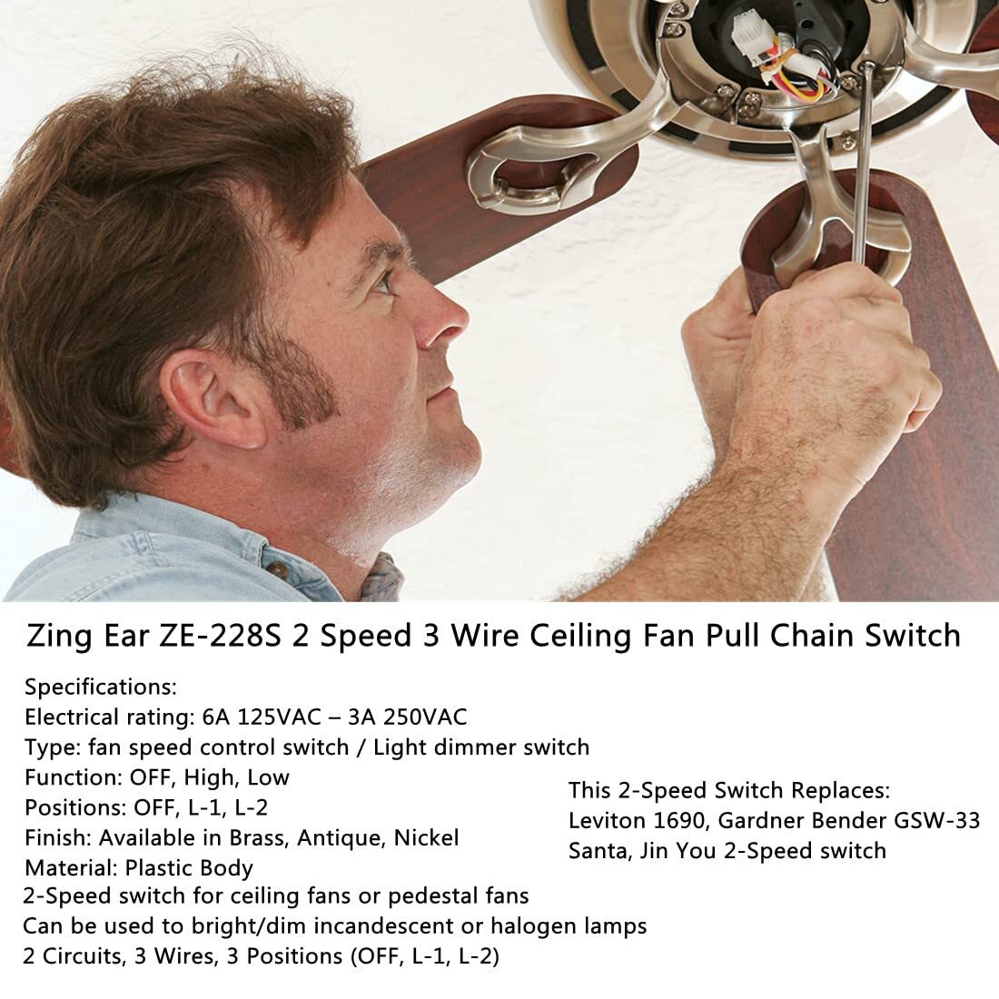 Exclusive Offers Await! Welcome to our stores! Satisfaction is what we guarantee. Ceiling Fan Switch Zing Ear ZE-228S 2 Speed 3 Wire Ceiling Fan Pull Chain Switch Speed Control Switch for Ceiling Fans, Wall Lamps, Cabinet Light, 2Pack Bronze Product Overview Notes: Before rewiring any ceiling fan, turn off electrical current at source by switching off circuit breakers. WARNING:Failure to disconnect power supply to ceiling fan may result in serious injury or death. Zing Ear ZE-228S replacement switch is used in 2-speed ceiling fans or pedestal oscillating fans. It can handle 6A at 125VAC or 3A at 250VAC. ZE-228S can also act as a dimmer switch for incandescent or halogen lamps when used with a 1N5404 diode. This switch is compatible with many ceiling fans including Monte Carlo, Harbor Breeze, Hampton Bay, Casablanca, Westinghouse, Hunter (e.g., 22272) and others. Zing Ear ZE-228S Specifications Electrical rating: 6A 125VAC – 3A 250VAC : fan speed control switch / Light dimmer switch UL approved (). See license here WOYR2.E89885 CSA certified Function: OFF, High, Low Positions: OFF, L-1, L-2 Material: Plastic Body Package including: Zing Ear ZE-228S fan switch Note: Comes without wire. Key Features Zing Ear ZE-228S switch for ceiling fans or pedestal fans. Electrical Rating: 6A 125VAC-3A 250VAC-6A 125VL. 2 Speed 3 Wire Pull Chain Fan Switch: 2 Circuits, 3 Wires, 3 Positions (OFF, L-1, L-2). Function: OFF, High, Low. Ceiling Fan 2 Speed Switch can be used to bright/dim incandescent or halogen lamps. Ceiling Fan Parts Certifications: UL approved () - CSA certified (Canada). The Pull Chain Fan Switch fits many ceiling fans including Hunter, Hampton Bay, Harbor Breeze, Westinghouse, Litex, Minka, and Casablanca. Payment Information ★ Secure payments through eBay. ★ We accept PayPal and all major credit cards. ★ Immediate payment required upon purchase. ★ For any payment issues, please contact our support team. Shipping Information ★ Orders are shipped to the address provided during checkout. Please verify your address. ★ We process orders within 1 business day (excluding weekends and holidays). ★ Standard delivery time is 3-5 business days. ★ We use trusted carriers like UPS, FedEx, and USPS. ★ Shipping is only available within the contiguous United States. No shipping to Alaska, Hawaii, Puerto Rico, or PO Boxes. ★ If there are any shipping delays, please contact us for support. Return Policy ★ We offer a 30-day return policy. ★ If you are not satisfied with your purchase, you can return it within 30 days for a full refund. ★ Please contact us to obtain the return address before sending back any items. ★ Items must be returned in their original condition and packaging.