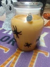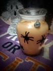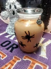 candles.- Glassware Jar filled with orange soy wax- has black widow spiders arranged around the jar has a Pumpkin Spice fragrance perfect candle for the fall season coming!