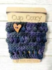 crochet handmade coffee cup drink cozy sleeve heart button purple print