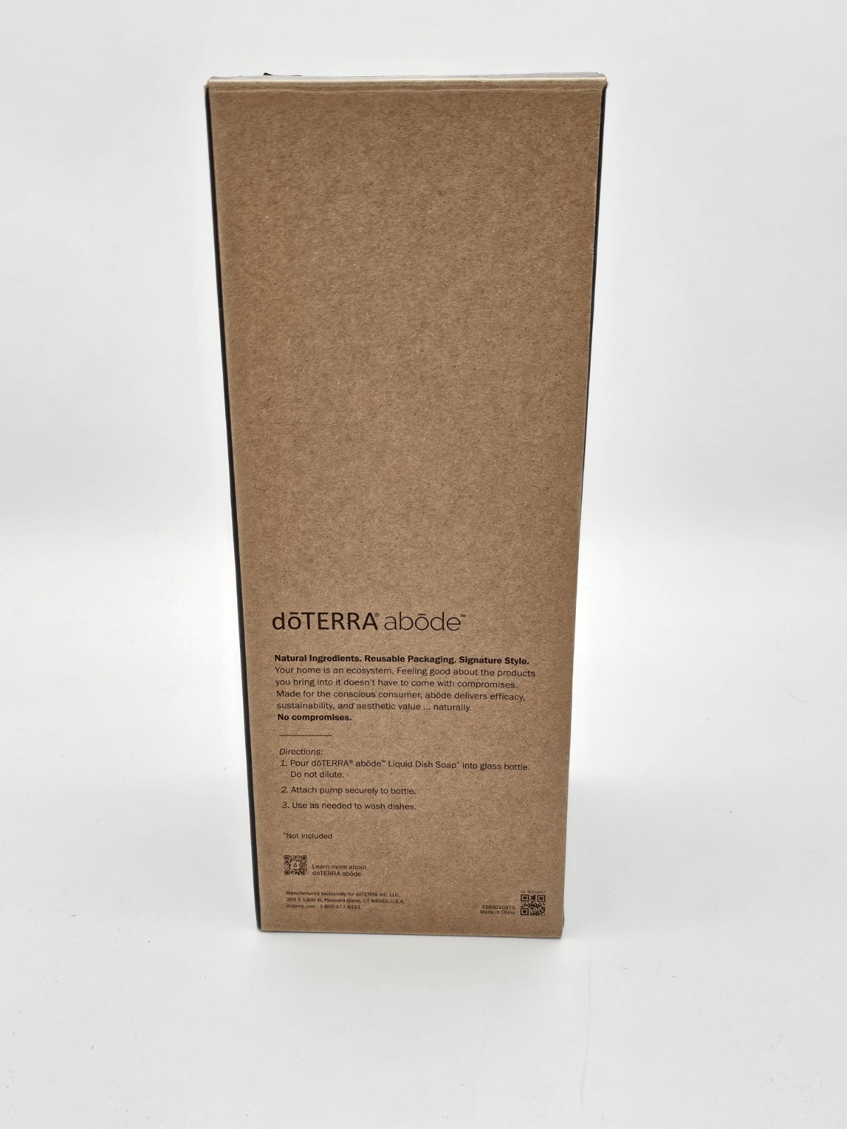 The box was opened, and the soap dispenser was removed for pictures only. The doTERRA Abode Dish Soap Dispenser is a refillable soap dispenser made of glass. It has a brown color and is designed for adults. The dispenser is specifically made for use in the kitchen and comes with a dish soap pump. It has a capacity of 16oz and is suitable for use with doTERRA branded essential oil blends.