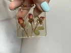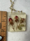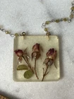 This beautiful necklace features a square-shaped pendant with a lovely design of dried flowers and dried roses, encased in clear resin. The necklace is 32 inches long and has a lobster closure. It is perfect for a variety of occasions, such as Mother's Day, engagements, graduations, Christmas, anniversaries, Father's Day, birthdays, and Valentine's Day. The necklace is handmade and has a unique style that will make a great addition to any jewelry collection. The pendant is not signed, but it is certain to catch the eye of anyone who sees it. The necklace is made of high-quality materials and is perfect for those who appreciate handmade jewelry. Handmade by me. Roses collected in Brentwood,California