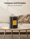 About this item Large 1500W Heat Outport - There are three modes, Natural wind, Low heating 900W, and High heating 1500W. Quickly heats up a small area in minutes. With strong heat output, you can feel the warmth immediately. 2S Fast Heating: Heat up efficiently and reaches the desired temperature instantly. Advanced Ceramic heaters are faster and more efficient than traditional fan heaters. You could put this electric space heater in the den/living room to keep the chill away while you watch TV. Great for a personal heater. Adjustable Thermostat: An easy-to-use adjustable thermostat is built into the small heater. The thermostat keeps it comfortably warm and saves you money on heating bills in the winter. Lightweight and easy to use. Gives an adequate amount of heat as a small unit used in a normal size bedroom. Portable Heater: Has an attractive look, and is easy to carry with a built-in handle. Ideal gift for yourself and your loved ones this winter. Small but powerful, noise is not intrusive. No need to worry about the fan sound keeping you awake. Applicable all year round and is suitable for dorms, bedrooms, offices, etc. Dimensions: 6.29” x 4.72” x 8.78”. Advanced Safety: Overheat protection and an enhanced tip-over switch ensures this indoor electric heater shut off instantly in any unsafe situation. Safety fall-over feature is a must. Automatically turns the unit off if overturned or lifted.