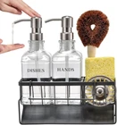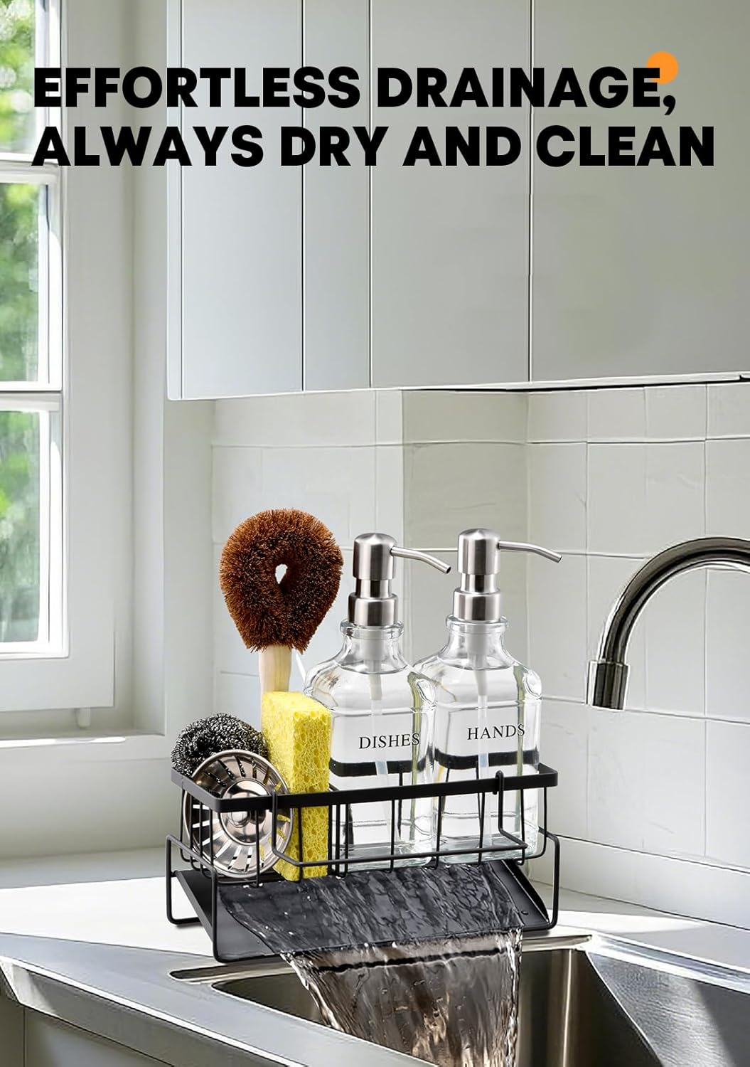 All-IN-ONE KITCHEN SINK ORGANIZER : No more messy countertops! Our integrated sponge holder for kitchen sink features a drainage system, a adjustable dividers and a stable towel rack, making it easy to keep your dish soap, hand soap, and sponges perfectly in place SELF-DRAINING DESIGN FOR A CLEANER SINK: Built to last, this rust-proof metal kitchen sponge caddy resists bending and corrosion. Its intelligently designed inclined base ensures efficient water drainage, allowing kitchen soap dispenser, sponges and brushes to dry quickly while improving air circulation. Keep your kitchen sink area clean, dry, and hygienic with ease LUXURY MEETS FUNCTIONALITY: Made from thick, reusable glass, our hand soap dispenser bottles are designed for sustainability. The stainless steel pumps provide a smooth, effortless press and resist rust over time FLEXIBLE KITCHEN STORAGE SOLUTIONS : Featuring a detachable towel rack and adjustable dividers, this dish soap dispenser for kitchen sink adapts to your needs. The removable towel bar offers a dedicated spot for drying, while adjustable compartments let you organize your cleaning tools effortlessly. Say goodbye to cluttered countertops WHAT DO YOU GET: This complete kitchen soap dispenser set includes a sturdy metal storage rack, two durable glass bottles with stainless steel pumps, four premium UV DTF labels and a sponge for easy customization. Designed for efficiency, it also features a removable towel bar, two adjustable dividers for flexible storage to keep your sink area neat and organized Dish Soap Dispenser with Sponge Holder - 16OZ Glass Bottle with stainless steel Pump, Metal Organizer with Adjustable Rails and Rag Holder, Effortless Drainage, Suitable for Kitchen Sink Countertop
